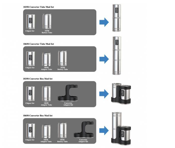 Converter Box Mod - интересный экземпляр для ценителей MTL-культуры от компании Ambition Mods, представляющий из себя некий многофункциональный девайс-конструктор 4 в 1, принимающий формы под разные форматы аккумуляторов.Устройство может питаться от батарей форматов 18650 либо 18350 (в комплект не входят) в зависимости от сборки. Минималистичная, но вариативная плата обеспечивает все необходимые меры безопасности и неплохой диапазон мощности от 1 до 50 ватт. В дополнение ко всему, можно переключаться на температурный контроль, bypass и другие режимы, Сопротивление варьируется в пределах от 0,1 до 3,0 Ом.